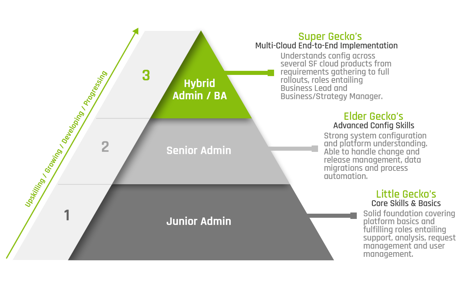 As we guide you from little gecko's covering basics for a solid foundation, to mature elder gecko's with advanced config skills and on to becoming fully fledged super gecko's, you'll know your place not only from a system perspective but also from a real-world role and job perspective.